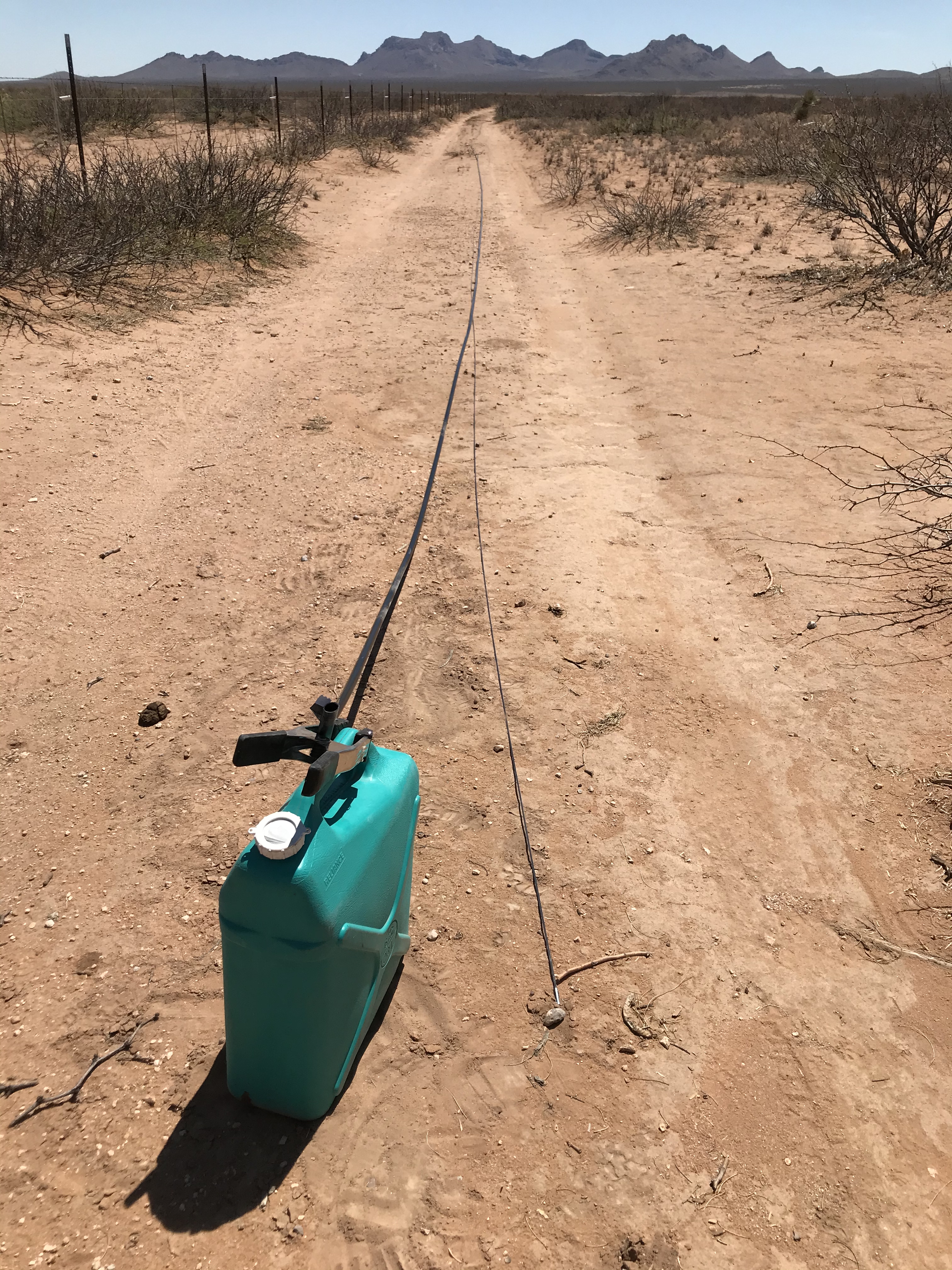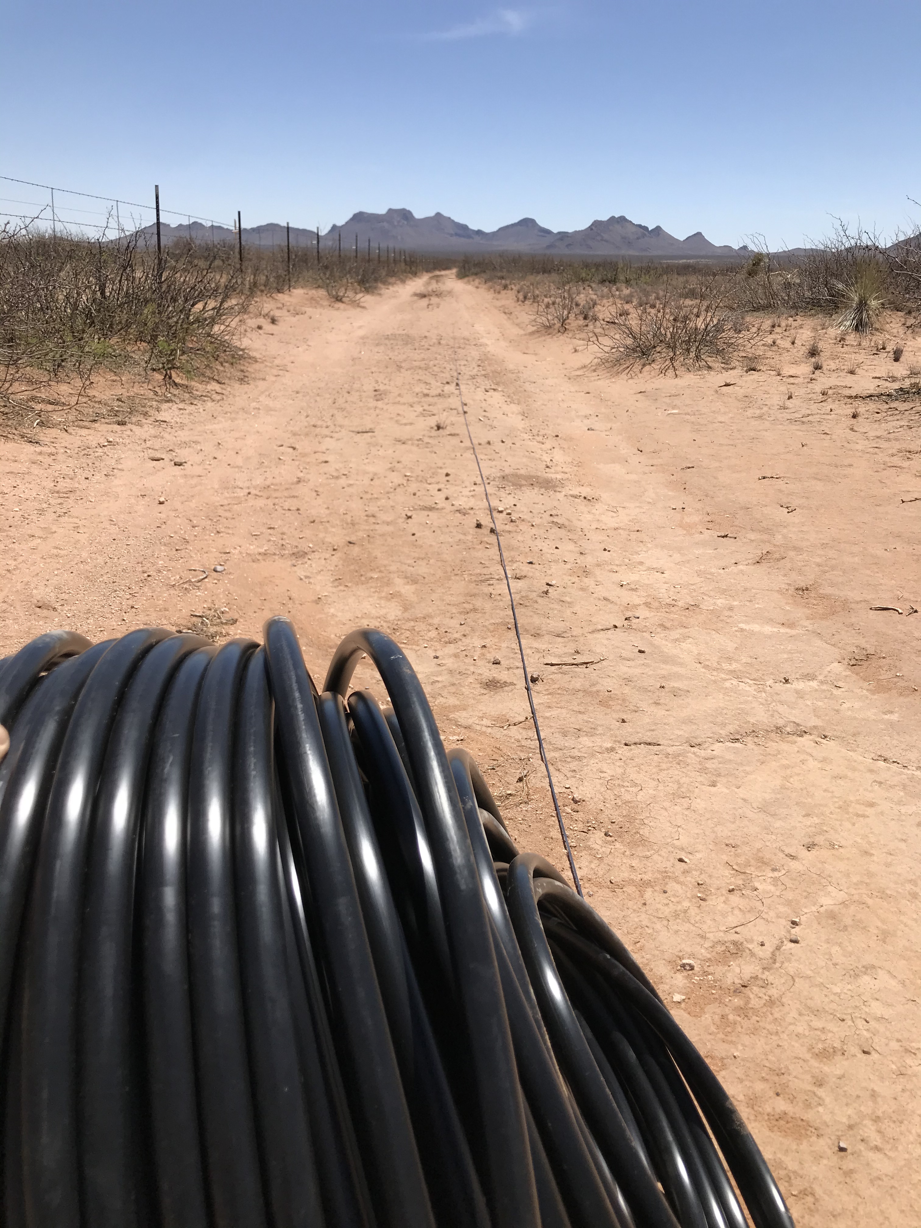 Step 1- roll out the irrigation tubing to the length that you need. I typically uses paces as a relative measure and give myself just a little extra so I don’t come up sort. Importantly, make sure the tubing lays flat and is not twisted from being in a coil. Step 2- roll out sensor cable to length alongside tubing. Because I did this work by myself, I used a full water jug to “hold” the end of the tubing. You can see the sensor cable on the ground by the tubing. Step 4- Roll out your fish tape starting at the end your cable and tubing, and go the distance you are threading beyond the end of the cable/tubing. Insert the fish tape end into the tubing, and gently walk the tubing along so that the fish tape threads through the tubing as you go. Through trial and error (is there any other way?) I found this was much faster than manually feeding the fish tape into the tubing off of the reel. Here is the fish tape I used, it was really helpful to have a high-quality one that was pretty long (~100 meters). Here the fish tape is fully threaded through the tubing.Final step- Attach the sensor cable to the end of the fish tape. I used electrical tape to ensure it did not separate inside the tubing. Once it is attached, the most gratifying step is walking the tubing along and watching the sensor cable zip into the tubing. If the tubing is rolled out well and you are working on flat ground, there should be very little force involved and the sensor cable should thread easily into the tubing.