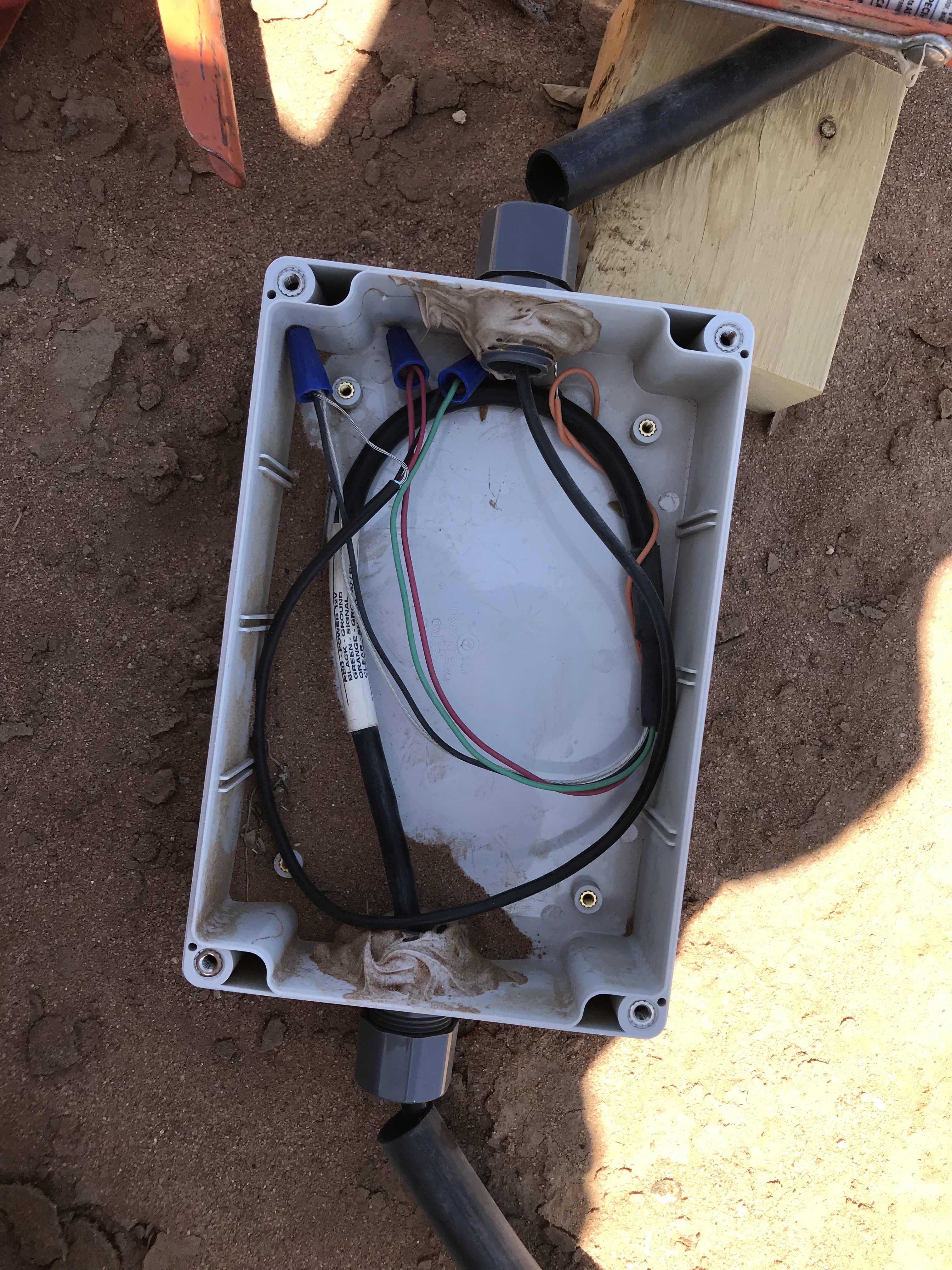 Here you can see how the sensor cable emerges from the tubing at a junction box. Also note the amount of wind-blown sediment in the box from just being open for a few hours!Once the junction box is completed, I wrap all joints with metal tape and then spray paint it white to deter any rodent chewing and help keep temperatures a little lower. Good luck!
